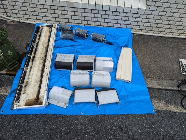 24h運転の天吊りエアコン薬品洗浄作業